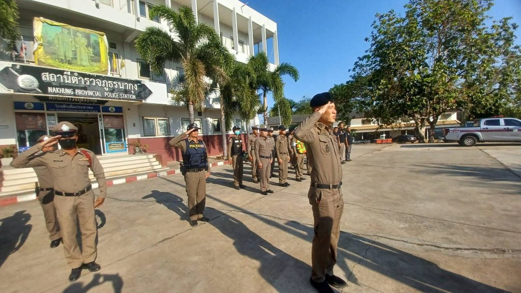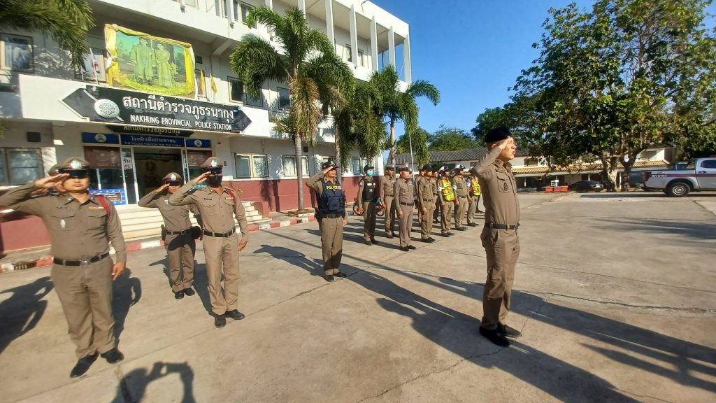 เวลา 08.00 น. พ.ต.อ.ภาสกร มหาวงค์นันท์ ผกก.สภ.นากุง นำข้าราชการตำรวจ สภ.นากุง เข้าแถวเคารพธงชาติ สวดมนต์ไหว้พระ กล่าวคำสัตย์ปฏิญาณ อุดมคติตำรวจ บทปลงใจ และชี้แจงข้อราชการ พร้อมกำชับในเรื่องระเบียบวินัย การปฏิบัติตาม นโยบายของผู้บังคับบัญชา ก่อนออกปฏิบัติหน้าที่ ณ ลานด้านหน้าอาคารที่ทำการสถานี