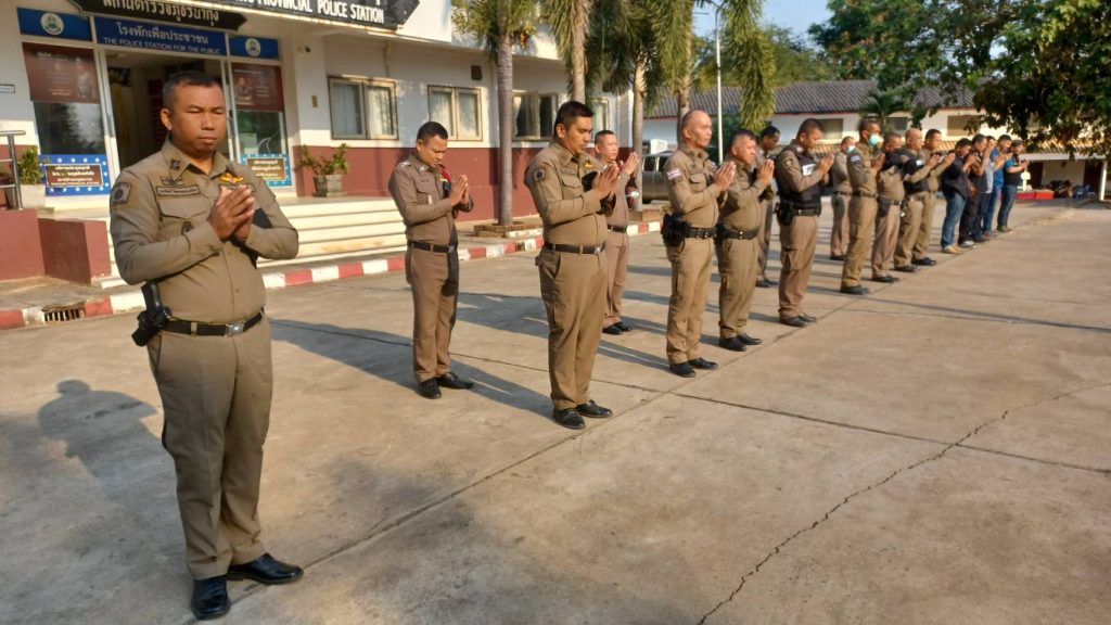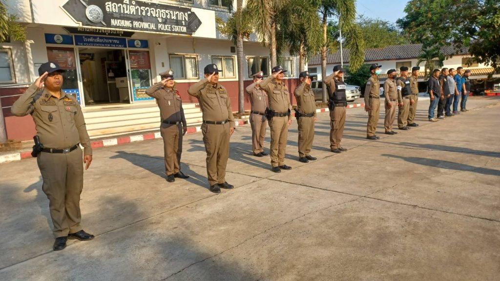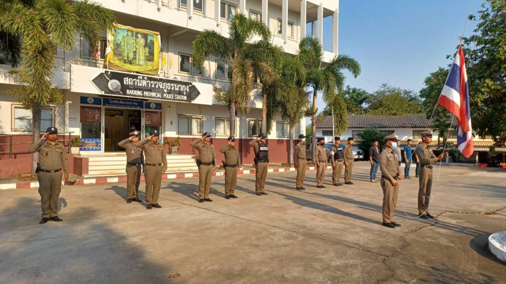 พ.ต.อ.ภาสกร มหาวงค์นันท์ ผกก.สภ.นากุง มอบหมายให้พ.ต.ท.นวรัตน์ โคตรแสนเมือง สวป.ฯ นำข้าราชการตำรวจ สภ.นากุง เข้าแถวเคารพธงชาติ สวดมนต์ไหว้พระ กล่าวคำสัตย์ปฏิญาณ อุดมคติตำรวจ บทปลงใจ และชี้แจงข้อราชการ พร้อมกำชับในเรื่องระเบียบวินัย การปฏิบัติตาม นโยบายของผู้บังคับบัญชา ก่อนออกปฏิบัติหน้าที่