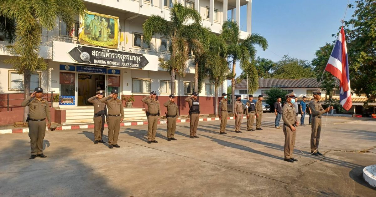 พ.ต.อ.ภาสกร มหาวงค์นันท์ ผกก.สภ.นากุง มอบหมายให้พ.ต.ท.นวรัตน์ โคตรแสนเมือง สวป.ฯ นำข้าราชการตำรวจ สภ.นากุง เข้าแถวเคารพธงชาติ สวดมนต์ไหว้พระ กล่าวคำสัตย์ปฏิญาณ อุดมคติตำรวจ บทปลงใจ และชี้แจงข้อราชการ พร้อมกำชับในเรื่องระเบียบวินัย การปฏิบัติตาม นโยบายของผู้บังคับบัญชา ก่อนออกปฏิบัติหน้าที่