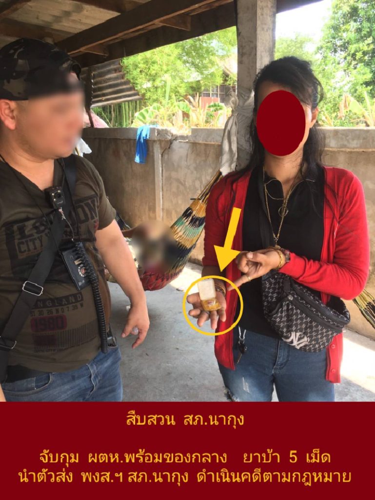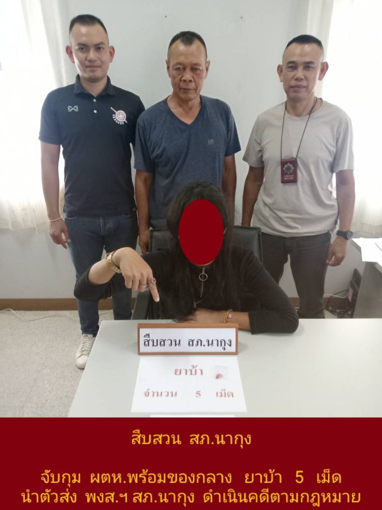 - (2)ผู้ต้องหาหญิง อายุ 29 ปี ราษฎร ต.บัวบาน อ.ยางตลาด กส.*** พร้อมของกลาง ยาบ้า จำนวน 5 เม็ด