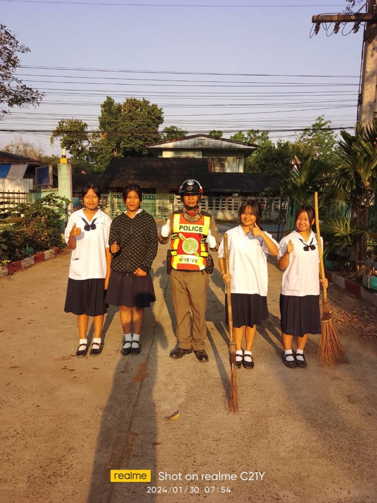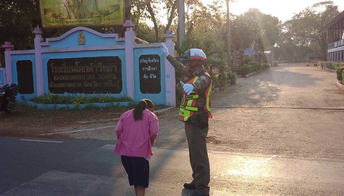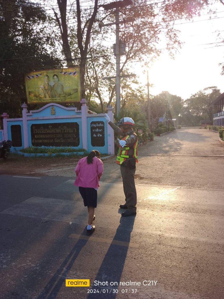 ด.ต.สมชาย ภูชำนิ ชุดจราจร สภ.นากุง อำนวยความสะดวกด้านการจราจรเพื่อปลูกฝังวินัยจราจร และหลักแห่งความปลอดภัยให้กับชุมชน บริเวณหน้า ร.ร.โคกคำวิทยา บ้านโคกคำ ต.บัวบาน อ.ยางตลาด ไป จ.กาฬสินธุ์