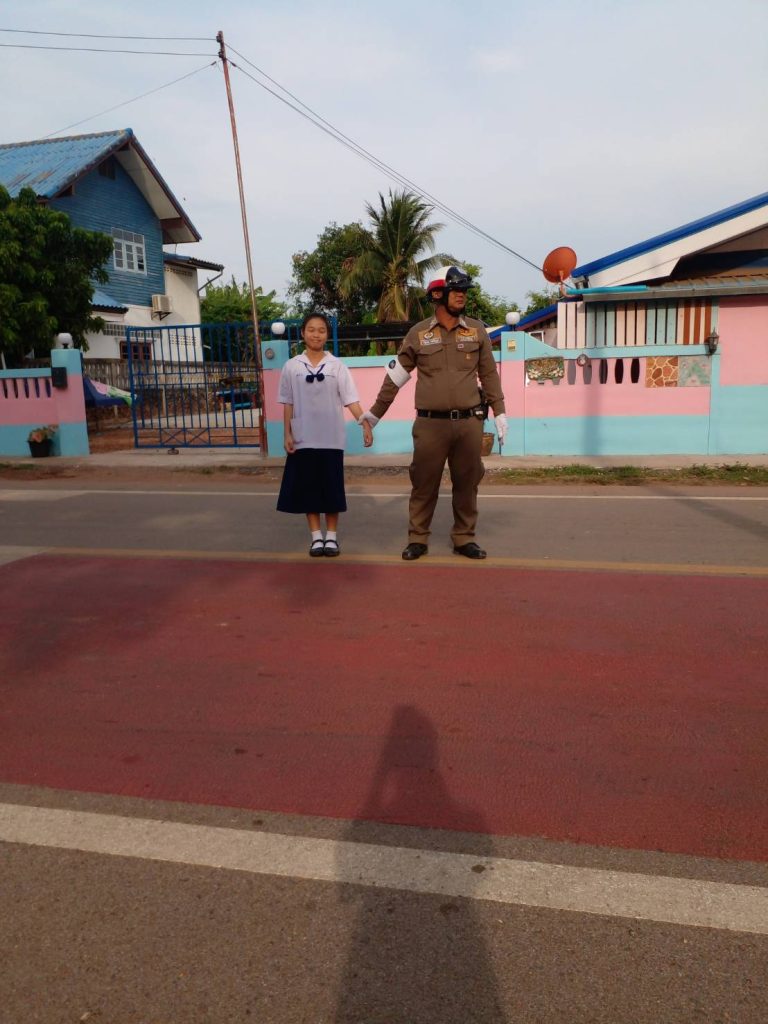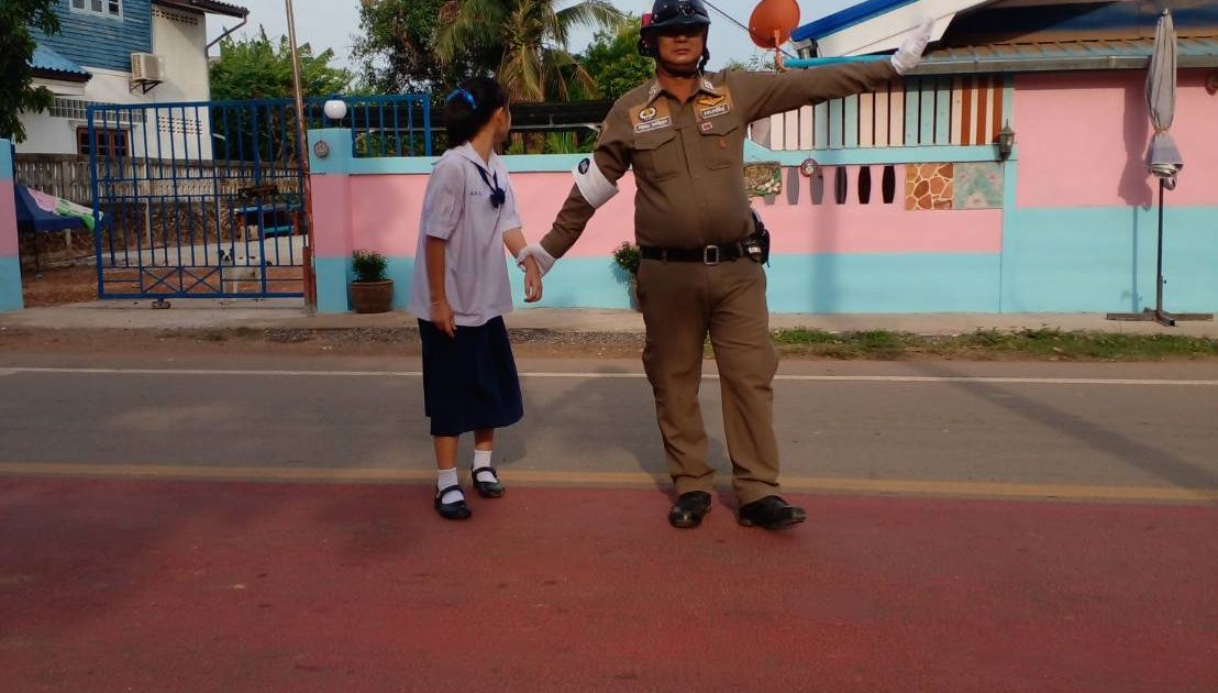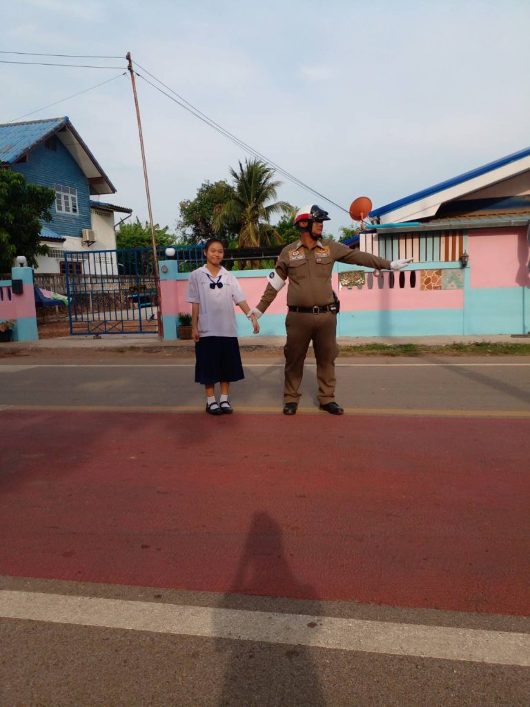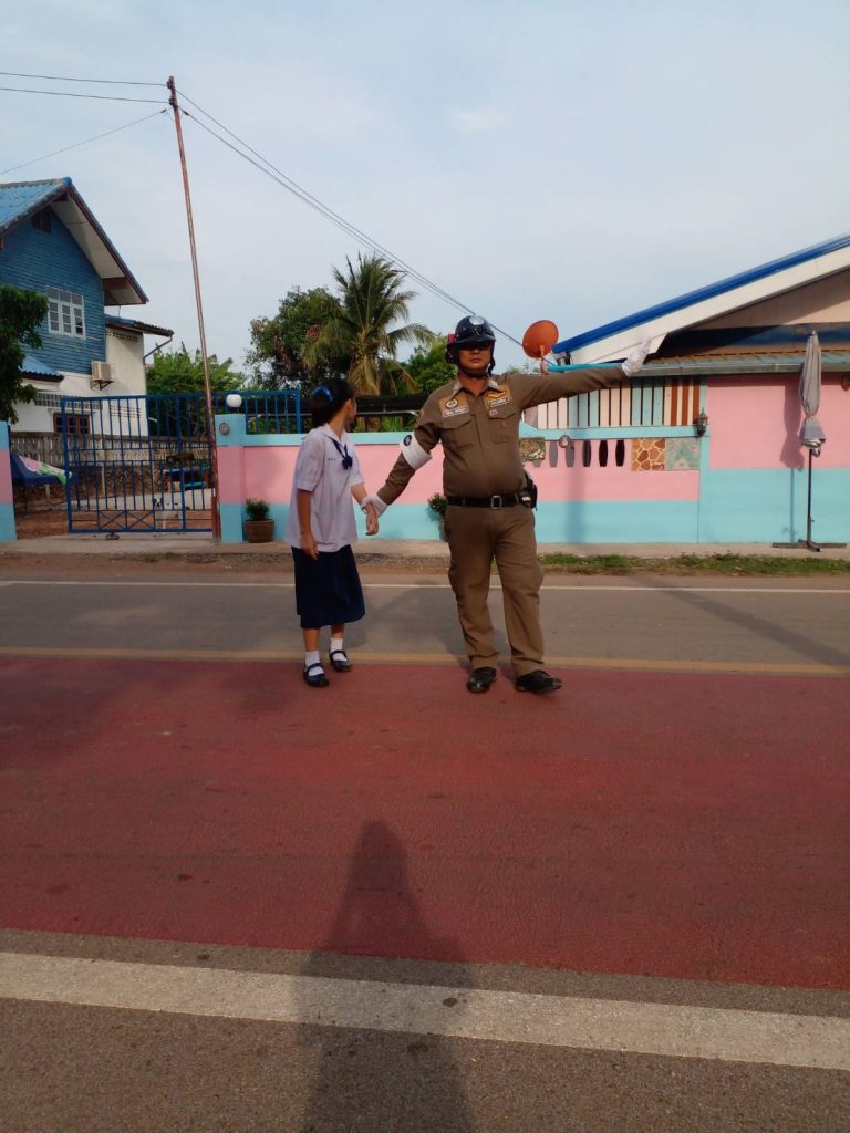 ด.ต.กฤษณะ วงษ์ปัญญา ผบ.หมู่(ป.) สภ.นากุง ปฎิบัติหน้าที่อำนวยความสะดวกด้านการจราจร เสริมสร้างวินัยจราจรและความปลอดภัยให้กับผู้ใช้รถใช้ถนน บริเวณหน้าโรงเรียนหนองกุงราษฏร์วิทยา ต.เขาพระนอน อ.ยางตลาด จ.กาฬสินธุ์