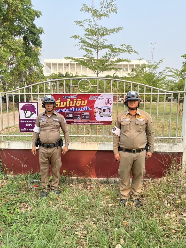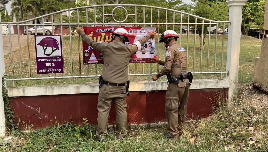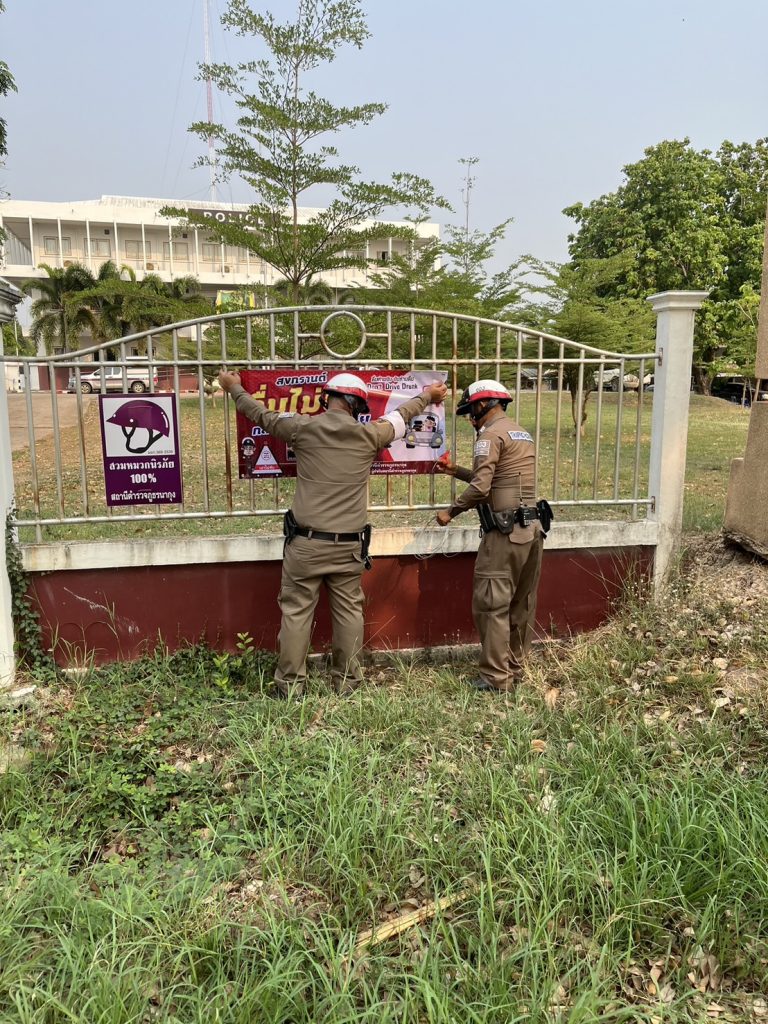 สายตรวจจราจร ติดป้ายประชาสัมพันธ์ เทศกาลสงกรานต์ 2567 หน้า สภ.นากุง