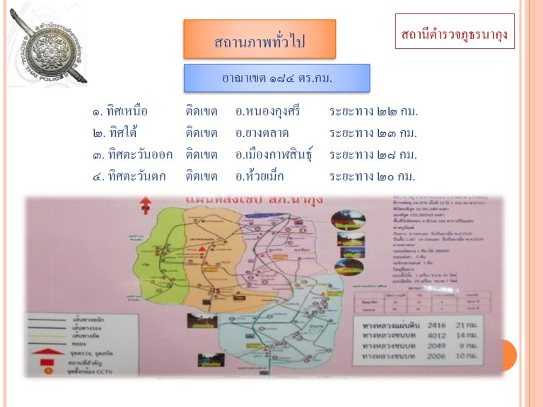การคมนาคม เดินทางโดยทางรถยนต์จากขอบพื้นที่ผ่าศูนย์กลางไปยังขอบอีกด้านหนึ่งของพื้นที่ใช้เวลาในการเดินทางประมาณ ๓๕ นาที และมีระยะทางห่างจากตัวจังหวัดกาฬสินธุ์เป็นระยะทาง ๓๐ กิโลเมตร ลักษณะการปกครองท้องที่ในความรับผิดชอบ แบ่งเป็น ตำบล ๔ ตำบล ได้แก่ ตำบลเขาพระนอน ตำบลบัวบาน ตำบลเว่อ ตำบลนาเชือก